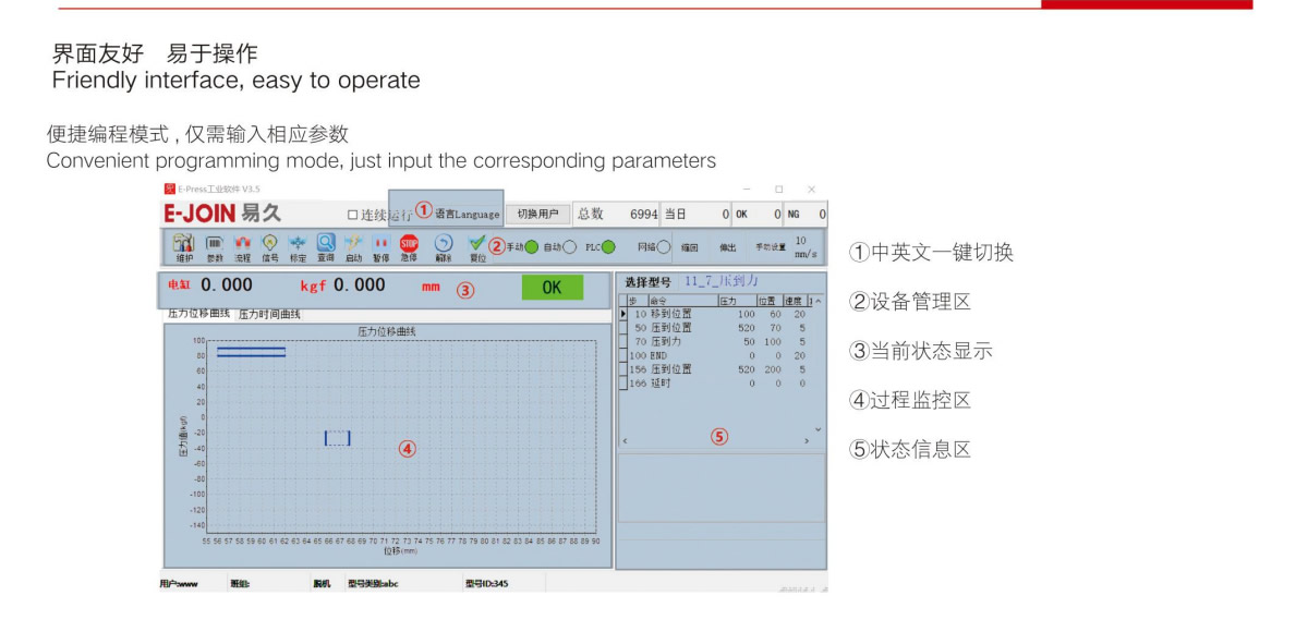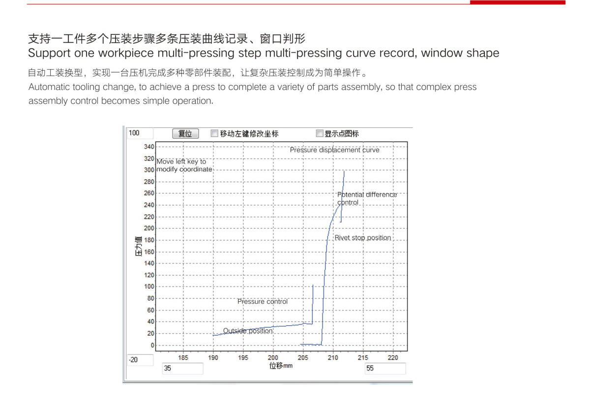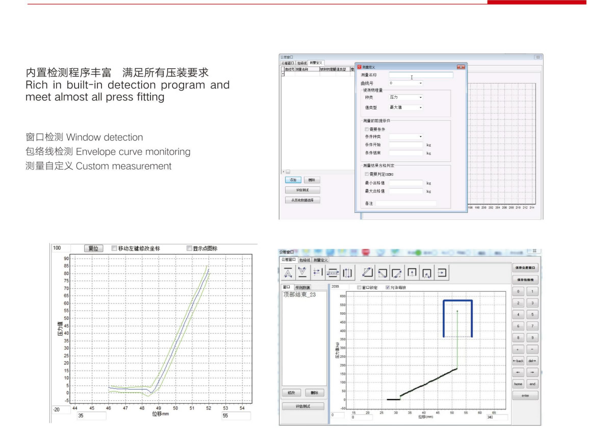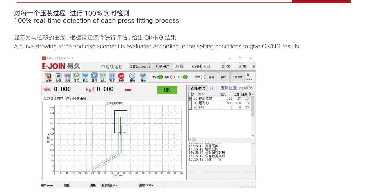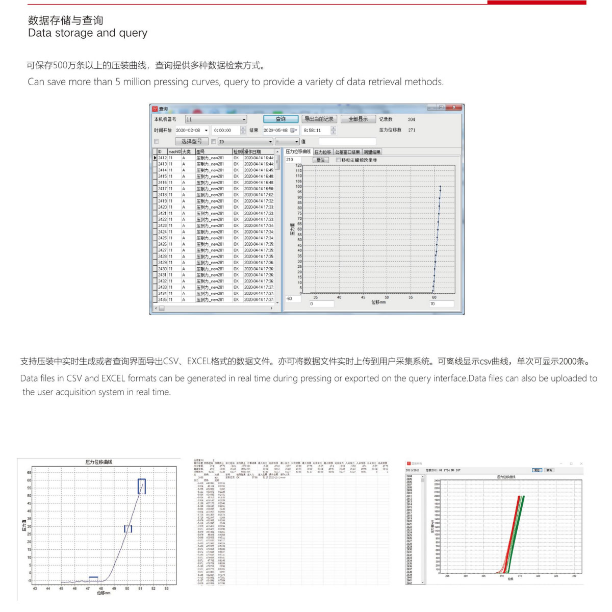 軟件基于 windows 平臺(tái),實(shí)現(xiàn)壓裝工藝流程編制,壓力位移曲線、壓力時(shí)間曲線實(shí)時(shí)顯示,一個(gè)工件多個(gè)壓裝步驟、多條壓裝曲線同時(shí)顯示。支持判斷窗口、包絡(luò)線、測(cè)量等評(píng)估功能,輸出 OKING 結(jié)果,用戶等級(jí)化管理可以設(shè)置不同權(quán)限,壓裝歷史記錄、操作日志、報(bào)警日志方便查詢。E-Press 工業(yè)軟件支持 MS SQL、ACCeSS 等主流數(shù)據(jù)庫(kù)格式。